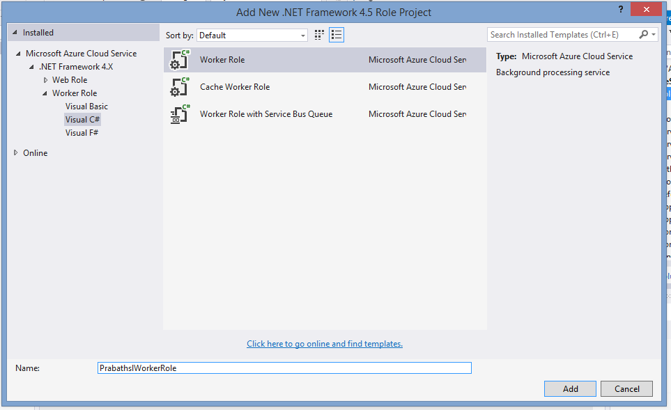 Then Select Worker Role and give name.. I'm giving PrabathslWorkerRole as name