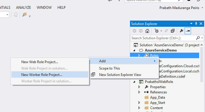 3. Goto AzureServiceDemo Solution and Roles then double click on PrabathslWorkerRole